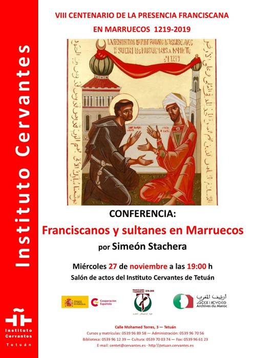 En el marco de celebraciones del VIII Centenario de la presencia franciscana en Marruecos, os invitamos a la conferencia Franciscanos y sultanes en Marruecos, que impartirá Simeón Stachera, fraile franciscano e investigador, el próximo miércoles 27 de noviembre a las 19:00h en el Instituto Cervantes de Tetuán.