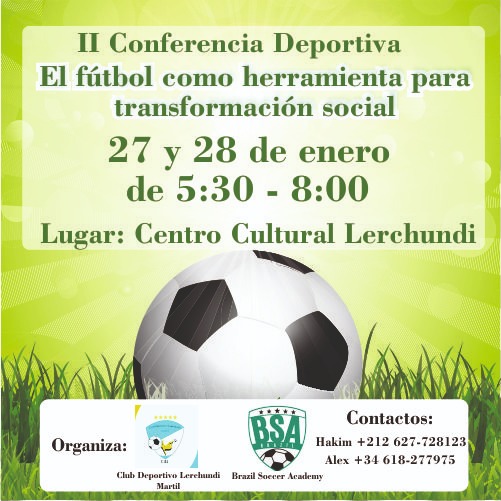 El Centro Cultural Lerchundi de Martil te invita a participar de una jornadas de confraternización deportiva, por iniciativa de la Academia Brasileña de Fútbol, en colaboración con nuestro Club Deportivo Lerchundi. Una institución que promueve el desarrollo deportivo, especialmente el fútbol, el nombre representa los pilares para los que se destina, la enseñanza a través del fútbol, ya sea técnico, educativo ó social y usa el deporte como fuente de socialización, desarrollo humano y entretenimiento.
